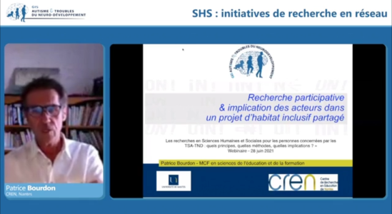 - 28 juin 2021 : Intervention de Patrice Bourdon, coordinateur du programme Participe 3.0 et de la Pii Hip Xp - Présentation d'une recherche en cours sur l'accès à l'habitat inclusif partagé pour les jeunes adultes TSA. Dans le cadre de la journée SHS / GIS autisme et TND, les recherches en Sciences Humaines et Sociales pour les personnes concernées par les TSA - TND : quels principes, quelles méthodes, quelles implications ? - Axe 4 : Interventions et accompagnements des personnes et de leurs aidants.