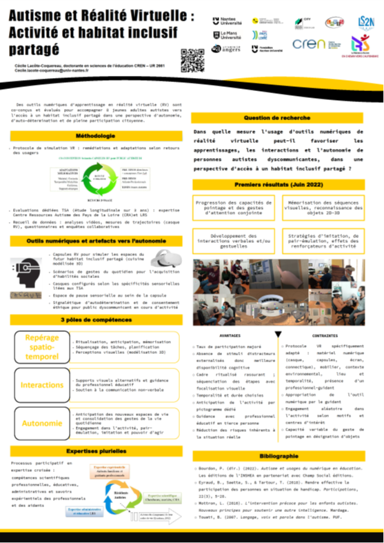 - Cécile LACOTE-COQUEREAU a communiqué le 5 octobre 2022 pour la session "Poster" dans le cadre de l'Université d’Automne ARAPI / GIS Autisme et TND au Croisic du 3 au 7 octobre 2022. Titre de la communication : "Recherche participative : protocole de simulation en réalité virtuelle pour adultes autistes dyscommunicants vers un habitat inclusif partagé". https://site.arapi-autisme.fr/les-universite-dautomne/